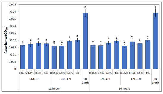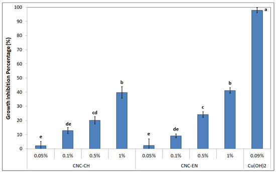 Growth inhibition percentage showed by CNC-CH and CNC-EN on Pto after 24 h. Data represent the mean and standard deviation; different letters show significantly different values after one-way ANOVA, followed by Tukey’s HSD post hoc test (p < 0.05).