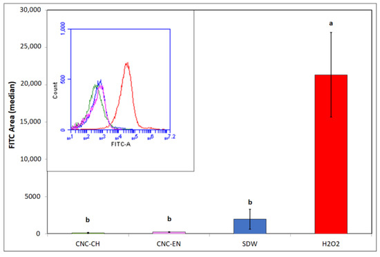 To evaluate generation of ROS in Pto cells, 2,7-dichlorofluorescein diacetate (DCFH-DA) was used in this experiment. Bacterial concentration of 107 CFU mL−1 was achieved in 1% w/v CNC suspensions made in tap water. Water and 2% v/v H2O2 were used as controls. Tubes were incubated as described in Section 4.3.2, then 100 µM DCFH-DA was added and allowed to react in the dark for 1 h. ROS were detected at 485/20 nm of fluorescence excitation wavelength and 528/20 nm of emission wavelength using a cytofluorimeter (Accuri C6 Plus, BD Bioscences, Franklin Lakes, NJ-USA) [54]. Values (presented as the average median of the fluorescent intensity in the FITC region) were obtained from the reading of 15,000 events per sample. Each thesis consisted of three replicates.
