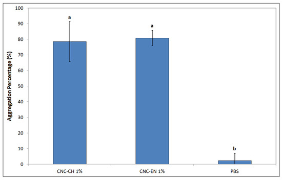 Aggregation of Pto cells after 12 h exposition to 1% w/v CNC-CH and 1% w/v CNC-EN. Data represent the mean and standard deviation; different letters show significantly different values after one-way ANOVA, followed by Tukey’s HSD post hoc test (p < 0.05).