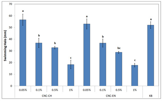 Swimming halos of Pto after 48 h of incubation at 27 °C on soft agar amended with different concentrations of CNC. Data represent the mean and standard deviation; different letters show significantly different values after one-way ANOVA, followed by Tukey’s HSD post hoc test (p < 0.05).