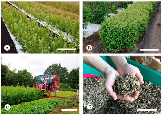 Mass production of leaves and teamaking from rabbiteye blueberry ‘Kunisato 35 Gou’. (A) Dense planting of cutting nursery. Bar = 50 cm. (B) Leaf production method similar to Japanese green tea cultivation. Bar = 50 cm. (C) Mechanical harvesting. Bar = 100 cm. (D) Dried tea leaves. Bar = 10 cm.