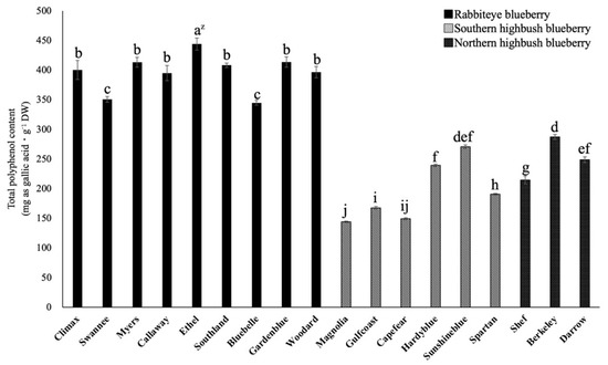 Comparison of the total polyphenol content in mature leaves of blueberry varieties. z Different letters among varieties represent significant differences at 5% level as determined by Tukey’s multiple range test (n = 3).