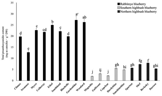 Comparison of the total proanthocyanidin content in mature leaves of blueberry varieties. z Different letters among varieties represent significant differences at 5% level as determined by Tukey’s multiple range test (n = 3).
