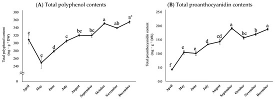 Leaves of rabbiteye blueberry throughout the growing seasons were tested for their total polyphenol content and total proanthocyanidin content (Figure 5A,B). Rabbiteye blueberry ‘Homebell’ had young leaves in the spring, and then immature leaves expanded and hardened for the summer and finally turned red and defoliated for the winter. The total polyphenol content decreased significantly at one point toward May but then increased rapidly toward October and stabilized toward December. On the other hand, the total proanthocyanidin content increased rapidly from April to September and then decreased slightly from October onward, but remained stable. In summary, the total polyphenol content and proanthocyanidin content of rabbiteye blueberry leaves varied significantly depending on the growth stage and were lower in spring and higher from summer to fall.