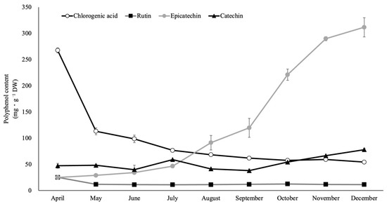 The leaves of rabbiteye blueberry contained four main polyphenols throughout the growing season: chlorogenic acid, rutin, catechin, and epicatechin. The content of chlorogenic acid, rutin, catechin, and epicatechin in the leaves of rabbiteye blueberry ‘Homebell’ was investigated throughout the growing season (Figure 6). In the April leaves immediately after expanding, chlorogenic acid accounted for 31.2% of the polyphenols that could be detected (268.0 gallic acid equivalents·g−1 DW). As the leaves grew, the chlorogenic acid content declined rapidly at first and then slowly after October. The rutin levels were not as high as those of chlorogenic acid but were high in April and then declined moderately. On the other hand, the epicatechin content of leaves was very low in April but increased rapidly after July and continued to increase until December, shortly before the leaves fell. The epicatechin content of leaves in December accounted for around 26.7% of the polyphenols detected (311.7 gallic acid equivalents·g−1 DW). Catechins were not high as a whole but increased moderately from September onward when the epicatechin content increased. As noted above, the polyphenolic composition of rabbiteye blueberry leaves changed dramatically as the leaves grew, with different major polyphenols.