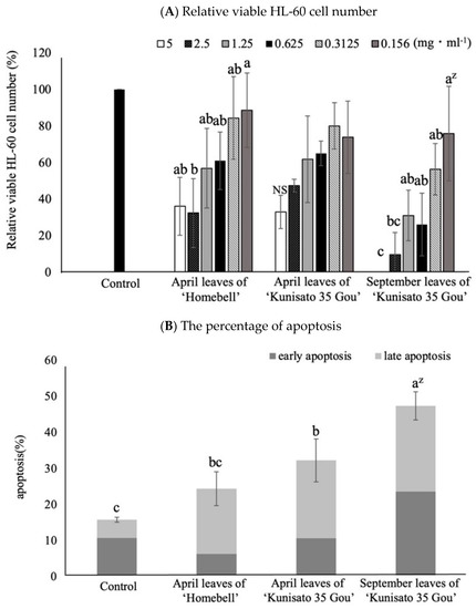 Figure 7A shows changes in the relative viability of the HL-60 cells (i.e., survival rate) by treatment with leaf extracts of ‘Homebell’ (April) and ‘Kunisato 35 Gou’ (April and September). In April, there were no significant differences in cell viability between the two treatments, although the survival rate tended to increase as the concentration decreased. In September, on the other hand, when treated with 5.0 mg·mL−1 ‘Kunisato 35 Gou’, there were no viable HL-60 cells. The survival rate tended to increase as the concentration of leaf extract decreased.