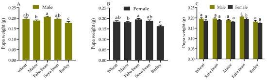 Pupa weight of S. frugiperda fed on the five host plants. Different letters (a, b, ab and c) indicate significant differences between pupal weights of males (A) and females (B) S. frugiperda fed on the five host plants (p < 0.05, Tukey’s test), and pupal weight of males and females (C) S. frugiperda fed on the same host plants (p < 0.05, Student’s t-test).