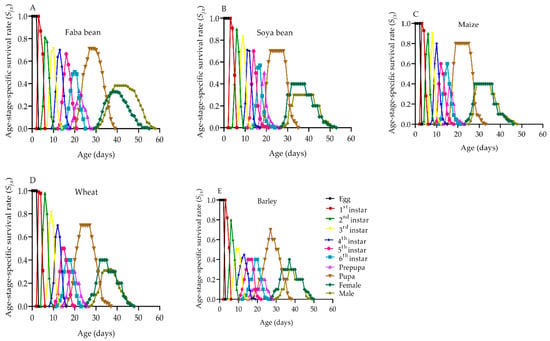 The host plants evaluated showed a substantial effect on whether a newly hatched neonate of S. frugiperda survived to age x and stage j (Figure 2). Due to the variations in the developmental rates among S. frugiperda individuals, clear overlaps between stages were observed among the host plants. However, a relatively higher survival rate of all developmental stages was observed in maize and wheat than in barley and soya beans. The survival rate of S. frugiperda larvae was highest when fed on maize (Figure 2C), with 84.21% of the eggs developing into the adult stage, and the lowest was recorded on barley (65.16%) (Figure 2E). The overall survival duration was longer in adult males than in adult females for S. frugiperda fed on all of the host plants (Figure 2A–E). Additionally, on each host plant, female adults appeared 1–2 d earlier than males (Figure 2A–E).
