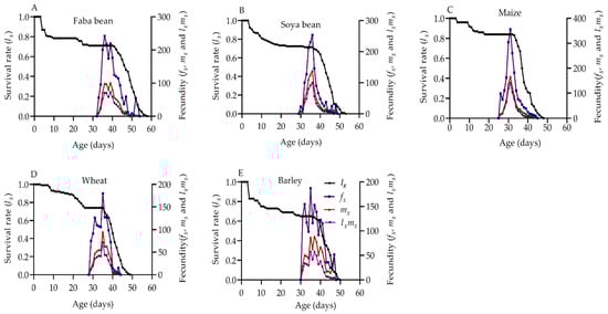 Age-specific survival rate (lx) and female age-stage specific fecundities (fx), fecundity (mx), and net maternity (lx×(lx×mx) of S. frugiperda fed on faba beans (A), soya beans (B), maize (C), wheat (D), and barley (E).