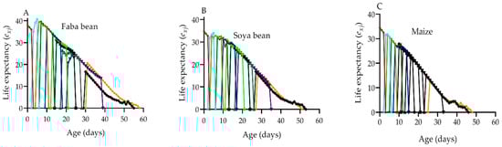 Age-stage specific life expectancy (exy) (i.e., the time that an individual of age x and stage y is expected to live) was calculated using the method described by [48]: