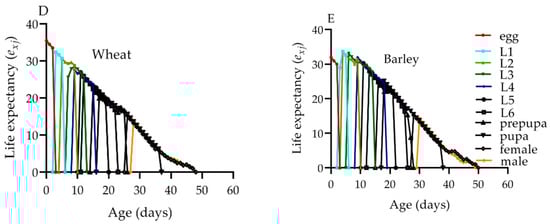 Life expectancy of S. frugiperda on faba beans (A), soya beans (B), maize (C), wheat (D), and barley (E). exj: the survival probability of an individual of age x and stage j.