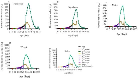 Age-stage specific reproductive value (vxj) of S. frugiperda on faba beans (A), soya beans (B), maize (C), wheat (D), and barley (E). vxj: the contribution of an individual of age x and stage j to future population growth.