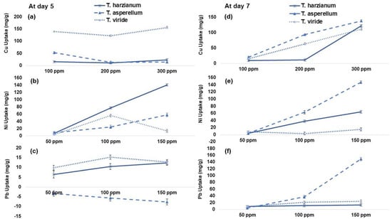 - Maldaner, J.; Steffen, G.P.K.; Missio, E.L.; Saldanha, C.W.; de Morais, R.M.; Nicoloso, F.T. Tolerance of Trichoderma isolates to increasing concentrations of heavy metals. Int. J. Environ. Stud. 2020, 78, 185–197. [Google Scholar] [CrossRef]