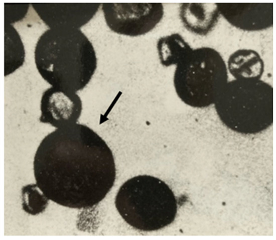 Large 2n pollen grain (arrow); remainder are n pollen grains of slightly variable size, and aborted grains from tetraploid Alborea 101 reported in Table 2 as producing 2n pollen. Alborea 101 is typical of all Alborea plants in this study. Photo X450, 1 cm = 40 microns.