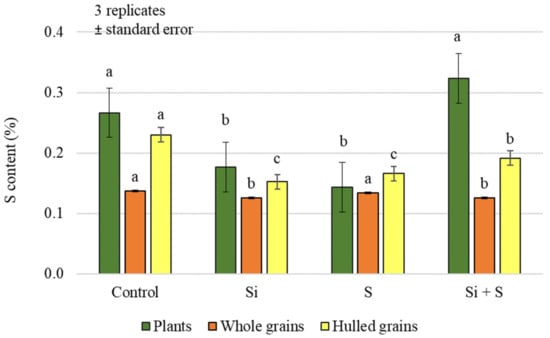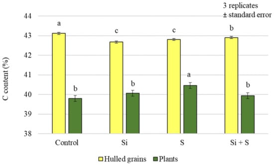 Silicon accumulation is known to decrease the carbon content of the aboveground tissues of plants, especially grasses like rice. Liu et al. [27] reported that, in their research, the C content of plants was negatively correlated with the Si content of plants, but carbon accumulation increased due to more Si being stored. Their results also suggest that Si plays an important role in regulating plant C accumulation and long-term C storage in salt-tolerant Si accumulators. We found a similar result in our study, that Si treatment mainly affected the C content of grains rather than green plant samples, and the control plots had the highest values. On the other hand, the sulphur treatment significantly increased the carbon content of the green plants, although no such correlation was found for hulled grains.