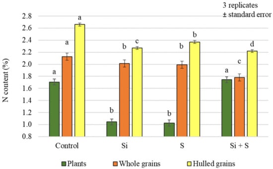 Different foliar fertiliser treatments caused statistically significant differences in nitrogen (N) content in both plant samples and grains (Figure 3). For the plant samples, the plots receiving the Si + S treatment had the highest N content (1.743%), but this was not significantly different from the control (1.707%). For the grains, the control plots had the highest N content (whole grains: 2.124%; hulled grains: 2.659%), and the difference was significant compared to the other treatments.