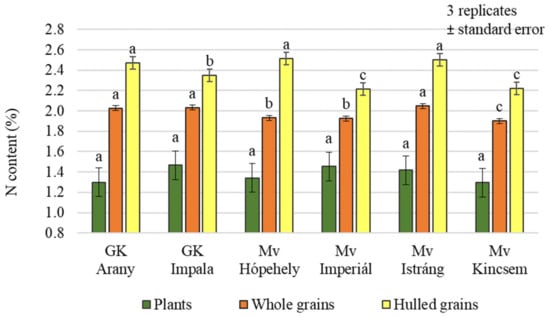 Small differences, both in whole and hulled grains’ nitrogen contents were measured between varieties (Figure 4), but the difference was significant in both cases (p = 0.001 and 0.007, respectively). On average across treatments, Mv Hópehely, Mv Istráng, and GK Arany clearly stood out from the other varieties, with higher N contents (2.51%, 2.50%, and 2.47%, respectively). No significant differences in nitrogen content were measured between the varieties in the plant samples (1.30%–1.47%).