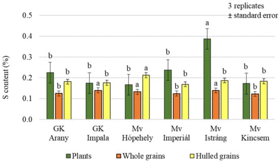 Sulphur content of the winter oat varieties (plants, whole and hulled grains); ± standard error of means. 3 replicates. The different letters indicate significant differences between the varieties, separately in different plant samples, at p = 0.05 level.