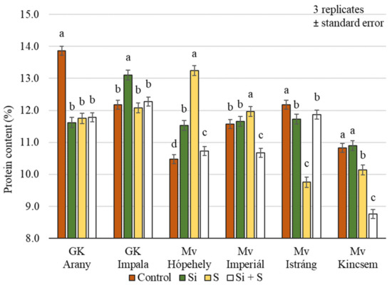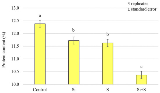 When we analysed the protein content of the whole grains, it was found that, similar to the nitrogen content, the control plots had the highest value (12.38%), and the (Si + S)-treated plots the lowest (10.37%). The treatments caused a significant difference in protein content (p < 0.001), but there was no detectable difference between the Si and S treatments. The standard deviation was quite small, ranging from 0.34% to 5.25% of the mean (Figure 7).