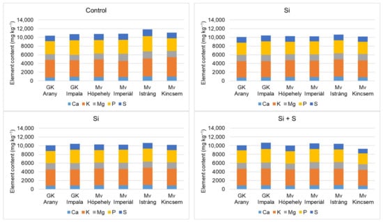 Figure 9 and Figure 10 show that the winter oat varieties did not respond equally to the foliar fertiliser treatments in terms of either macronutrient or micronutrient contents. When P, K, Ca, Mg, and S were summarised, the control treatment was the best. Among the varieties, Mv Istráng stood out in the control, Si, and S foliar fertilisation treatment plots, while Mv Kincsem was second. In the Si + S treatment, the GK Impala variety had the highest combined P, K, Ca, Mg, and S contents. Mv Imperiál had the highest Mg content in the grains, and also the highest Mn and Mo concentrations (Figure 6 and Figure 7). The black-seeded winter oat variety Mv Imperiál had average values, not significantly different from the other varieties.