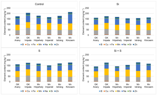 Our hypothesis was partially confirmed, as for some elements (Mn, Mo, Li, and Ba) silicon, sulphur, and the combined treatment increased accumulation in the grain, but for most elements the deposition was lower, or did not change significantly (B and Mg) in the treated plots, both in whole or hulled grain and in green plant samples. Protein content was also highest in the untreated plots, although the response of the varieties was very different.