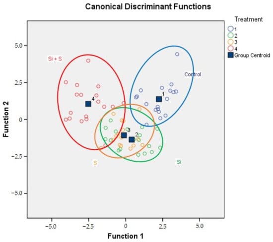 The combined groups plot of discriminant analysis for foliar fertiliser treatments (Debrecen, 2021). (Treatment 1: Control; Treatment 2: Si; Treatment 3: S; Treatment 4: Si + S).