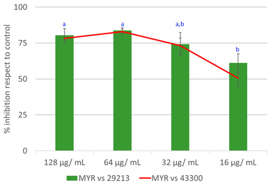 The crude extract of M. cisplatensis (MYR) was tested for its antimicrobial potential against S. aureus ATCC 29213 and S. aureus ATCC 43300 (methicillin-resistant strain (MRSA)) using a broth microdilution assay. The extract showed promising activity on both strains, reporting the same inhibitory effects. MYR strongly reduced the growth of both strains (about 83%) at 64 μg/mL; a good antimicrobial activity was kept until the concentration of 16 μg/mL (Figure 1). The positive control, vancomycin, strongly inhibited the growth at 2 μg/mL (88.8% ± 2.1), whereas oxacillin was not able to inhibit the growth of the MRSA. The negative control methanol did not affect the cell growth at any of the tested dilutions.