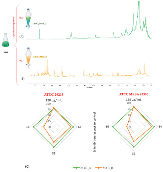 Liquid–liquid separation of methanolic extract and 1H-NMR profiling of organic fractions (A,B). Antimicrobial screening of MYR_A and MYR_B (C).