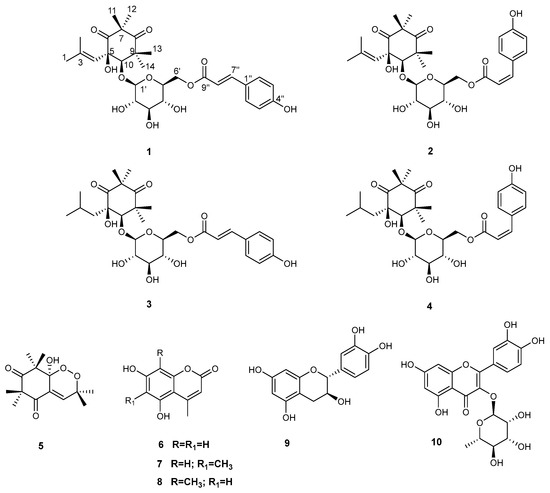 Chemical structure of compounds 1–10, isolated from leaves of M. cisplatensis.