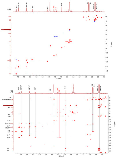 NMR spectra were recorded at 25 °C on 300.03 MHz for 1H and 75.45 MHz for 13C on a Bruker AVANCE II 300 MHz NMR Spectrometer Fourier transform in CD3OD or CDCl3 (Bruker, Billerica, MA, USA). Chemical shifts are reported in δ (ppm) and referenced to the residual solvent signal; J (coupling constant) is reported in Hz.1H-NMR spectra were acquired over a spectral window from 14 to −2 ppm, with 1.0 s relaxation delay, 1.70 s acquisition time (AQ), and 90° pulse width = 13.8 µs. The initial matrix was zero-filled to 64 K. The 13CNMR spectra were recorded in the 1H broadband decoupling mode, over a spectral window from 235 to −15 ppm, 1.5 s relaxation delay, 90° pulse width = 9.50 µs, and AQ = 0.9 s. The number of scans for both 1H and 13C-NMR experiments was chosen, depending on the concentration of the samples. With regard to the homonuclear and heteronuclear 2D-NMR experiments, the data points, number of scans, and increments were adjusted according to the sample concentrations. Correlation spectroscopy (COSY) spectra were recorded with a gradient-enhanced sequence at spectral widths of 3000 Hz in both f2 and f1 domains; the relaxation delays were 1.0 s. Nuclear Overhauser effect spectroscopy (NOESY) experiments were performed in the phase-sensitive mode. The mixing time was 500 ms, and the spectral width was 3000 Hz. For all the homonuclear experiments, an initial matrix of 512 × 512 data points was zero-filled to give a final matrix of 1 k × 1 k points. Proton-detected heteronuclear correlations were also measured. Heteronuclear single-quantum coherence (HSQC) experiments (optimized for 1J(H,C) = 140 Hz) were performed in the phase-sensitive mode with field gradient. The spectral width was 12,000 Hz in f1 (13C) and 3000 Hz in f2 (1H) and had a 1.0 s relaxation delay; a matrix of 1 k × 1 k data points was zero-filled to give a final matrix of 2 k × 2 k points. Heteronuclear 2-bond correlation (H2BC) spectra were obtained with T = 30.0 ms and a relaxation delay of 1.0 s; a third-order low-pass filter was set for 130 < 1J(C,H) < 165 Hz. A heteronuclear multiple-bond coherence (HMBC) experiment (optimized for 1J(H,C) = 8 Hz) was performed in the absolute value mode with field gradient; typically, 1H–13C gHMBC were acquired with a spectral width of 18,000 Hz in f1 (13C) and 3000 Hz in f2 (1H) and 1.0 s of relaxation delay; the matrix of 1 k × 1 k data points was zero-filled to give a final matrix of 4 k × 4 k points. Heteronuclear single-quantum coherence–total correlation spectroscopy (HSQC-TOCSY) experiments were optimized for nJ(H, C) = 8 Hz, with a mixing time of 90 ms.