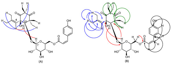Selected NOESY correlation (A) and H-C long-range correlations (B) of compound 2 evidenced in HMBC. Blue, red, green and black arrows are referred to correlelations of isobutylene, cyclohexadione, p-coumaroyl and glucose moiety, respectively.