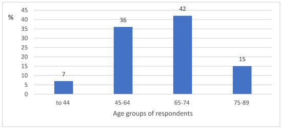 In total, 74 respondents took part in the survey for the evaluation of local knowledge about the species. The respondents’ distribution by age is as follows: up to 44 years old—5; 45–64 years old—27; 65–74 years old—31; and 75–89 years old—11 respondents. The percentage distribution of the respondents by age groups is presented in Figure 2. More than three-quarters of all respondents were women. The survey revealed that only 7% of all respondents (two women from Svencelė, one woman and one man from Kintai, and one man from Rusnė) knew of M. gale. One respondent told us that as a child he was taught to identify M. gale by his grandmother, while the other respondents knew this plant from books and/or booklets of the Svencelė Telmological Reserve, radio broadcasts, etc. Almost all of them were middle-aged, except for the man from Rusnė, who represented the elderly group. Spearman’s correlation analysis showed a strong (r = 0.71) but not statistically significant correlation between the respondents’ time of familiarity with M. gale and their age. The respondents who lived closer to the Svencelė habitat knew M. gale for a shorter time (only 5–8 years), while those who lived in more remote places from this habitat (as in Kintai and Rusnė) knew this plant for a longer time. The distance of the respondents’ place of residence from the Svencelė habitat of M. gale had no significant influence on the identification of the species.