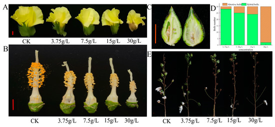 After 15 days of treatment with glyphosate spray, the corolla of the treated group gradually became smaller as the concentration of glyphosate treatment increased, compared to the control group, while the color of the bracts in the 30 g/L treated group changed from green to light pink (Figure 1A). The anthers gradually did not dehisce, the filaments gradually shortened, the anther gradually crinkled and became smaller, and the stigma gradually elongated (Figure 1B). The treatment of 30 g/L glyphosate led to the abnormal development of ovules (Figure 1C). The peak flowering stage appeared 30 days after the glyphosate treatment, the flowers from the control group (CK) were selected to pollinate the treatment groups, and 30 flowers were hybridized in each treatment. The number of adult bolls at harvest was investigated. We found that up to 80% of the boll setting percentage was achieved in the treatment groups at concentrations below 15 g/L, while the boll setting percentage was below 6.6% at 30 g/L (Figure 1D). According to the phenotype (Figure 1E) at harvest and the above results, it recommends that when spraying the herbicide glyphosate, the maximum concentration should not exceed 15 g/L.