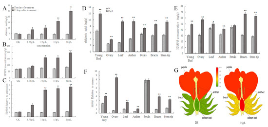 In addition, glyphosate treatment increased EPSPS synthase concentrations in the stem tips, bracts, ovaries, young buds, anthers, leaves, and petals by 1.19, 1.14, 0.83, 0.61, 0.30, 0.19, and 0.05-fold, respectively, compared to the pretreatment, with the lowest EPSPS concentrations observed in the anthers (Figure 2E). After glyphosate treatment, the EPSPS genes expression levels were 13.61, 4.10, 2.59, 2.59, 2.35, and 1.75 times higher in the ovaries, bracts, leaves, stem tips, anthers, and young buds, respectively, than in the controls (Figure 2F). The highest and the lowest were observed in the ovaries and anthers, respectively (Figure 2F). Simply, 15 g/L glyphosate causes male abortion, yet the female organs were shown to regularly grow (Figure 2G).
