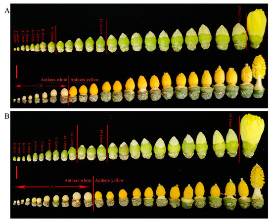 The effect of glyphosate on buds and anthers. (A) Developmental dynamics of buds and anthers treated with water; (B) developmental dynamics of buds and anthers treated with 15 g/L glyphosate. The scale bar is 1 cm.