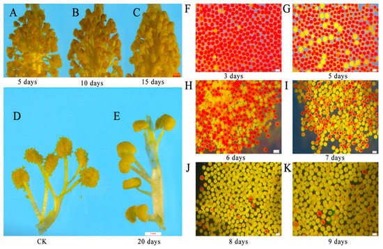 The effect of glyphosate on the anther dehiscence and pollen grain viability. (A–C) The anthers were treated with 15 g/L glyphosate for 5 days (A), 10 days (B), and 15 days (C); (D) the anthers were treated with water for 20 days; (E) the anthers were treated with 15 g/L glyphosate for 20 days; (F–K) the pollen grains treated with 15 g/L glyphosate for 3 days (F), 5 days (G), 6 days (H), 7 days (I), 8 days (J), 9 days (K). (A–E) The scale bars are 1 mm. (F–K) The scale bars are 0.1 mm.