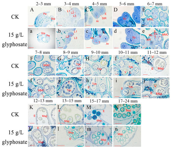 To determine the critical period of pollen abortion caused by glyphosate, 2–24 mm buds were fixed in FAA (formaldehyde, acetic acid, ethanol, and water, 10:5:50:35, v/v), then, dehydrated, transparent, wax-dipped, embedded, sectioned, spread, dried, transparent, rehydrated, stained (5% toluidine blue, v/v), dehydrated, transparent, and sealed [45]. The permanently stained sections were observed and photographed using a DM2500 (Leica) microscope (Wetzlar, Germany).
