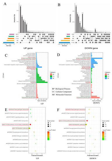 The number, GO annotation, and KEGG enrichment of differentially expressed genes were identified in glyphosate-treated and control groups. (A,B) The number of differentially expressed genes in the anthers of different lengths of buds; (C,D) GO annotation of the differentially expressed genes; (E,F) KEGG enrichment of the differentially expressed genes.