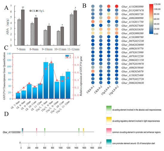 Abscisic acid content in anthers and the expression of abscisic acid response-related genes in glyphosate-treated and control groups. (A) Abscisic acid content in anthers of different-lengthed buds. * indicates a significance level of p < 0.05 and ** indicates an extremely significant level of p < 0.01. (B) Expression heatmap of the abscisic acid response-related genes in anthers of 8–9 mm buds. (C) Expression of GbTCP14 gene in transcriptome with qRT–PCR. (D) Promoter analysis of the Gbar_A11G003090 gene.