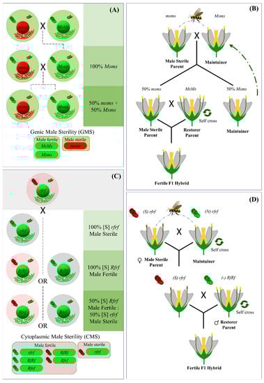(A) Simple genetic model of Genic male sterility (GMS), (B) Maintenance of parent line and hybrid seed production for GMS, (C) Simple genetic model of Cytoplasmic Male Sterility (CMS), (D) Maintenance of parent line and hybrid seed production for CMS.