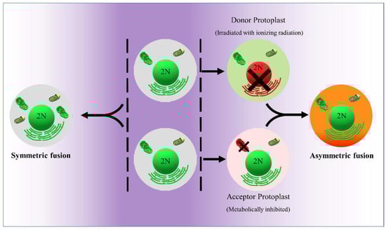 In 1972, Carlson et al. reported the first successful production of somatic hybrids, of Nicotiana glauca and N. langsdorffii, showing that organelles transfer is possible and therefore transfer is not limited to genetic material only [86]. Among other strategies available, CMS can be experimentally induced through protoplast fusion and somatic hybridization, which is a technique additively combining the somatic cells from two different genotypes, cultivars, species, or genera aimed at regenerating an entirely novel genotype [87]. In general, a standard somatic hybridization strategy comprises four steps (Figure 3): (a) isolation of parental protoplasts, (b) their chemical or electrical fusion, (c) culture of the heterokaryons obtained to regenerate first hybrid callus then plants, and finally (d) identification and selection of the somatic hybrid lines of interest. Such protoplast fusions may be symmetric, when the contribution of each parent is equivalent (2n = 2x + 2x), or asymmetric when one parent contributed the nuclear and the other the cytoplasmic genetic information (2n = 2x). The latter requires limiting the genetic contribution of one of the parents, for instance by inactivating the nucleus of the donor parent using radioactivity or chemicals (Figure 3) giving rise to a cytoplasmic hybrid or cybrid [88].
