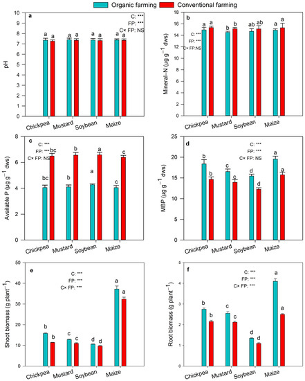 pH value (a), content of mineral-N (b), available P (c), MBP (d), shoot biomass (e), and root biomass (f) in organic and conventional farming. Different lowercases indicate significant differences (Tukey’s post hoc test) between crops in the same farming practice (p < 0.05). The crops (C) and farming practice (FP) specify the results of MANOVA indicating p-value at different significance levels, *** p < 0.001, NS: not significant). The values are two-year average mean ± SD. MBP, microbial biomass P; ALP, alkaline phosphatase.