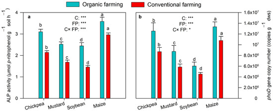 ALP activity (a) and phoD gene copy number (b) in organic and conventional farming. Different lower cases indicate significant differences (Tukey’s post hoc test) between crops in the same farming practice (p < 0.05). The crops (C) and farming practice (FP) specify the results of MANOVA indicating p-value at different significance levels (* p < 0.05, *** p < 0.001). The values are two-year average mean ± SD. MBP, microbial biomass P; ALP, alkaline phosphatase.