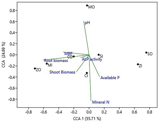 Ordination plot of CCA (Canonical Correspondence Analysis) to exhibit the correlation between soil variables and phoD encoding community structure. CO, chickpea organic farming; CI, chickpea conventional farming; MO, mustard organic farming; MI, mustard conventional farming; SO, soybean organic farming; SI, soybean conventional farming; ZO, maize organic farming; ZI, maize conventional farming; MBP, microbial biomass P.
