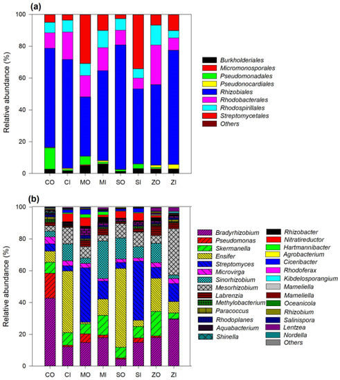 (a) Relative abundance of phoD-harboring bacterial communities under organic and conventional farming practices and different crops at the order level. (b) Relative abundance of phoD-harboring bacterial communities under organic and conventional farming practices and different crops at the genera level. CO, chickpea organic farming; CI, chickpea conventional farming; MO, mustard organic farming; MI, mustard conventional farming; SO, soybean organic farming; SI, soybean conventional farming; ZO, maize organic farming; ZI, maize conventional farming.