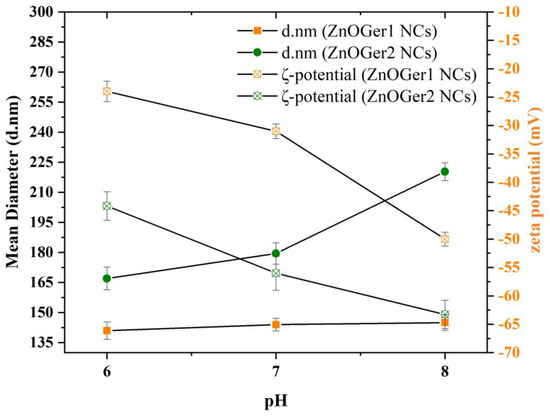 | ZnOGer1 NCs | 8 | 145 ± 2.91 | 0.37 ± 0.04 | −50 ± 1.23 |