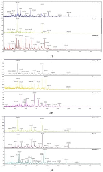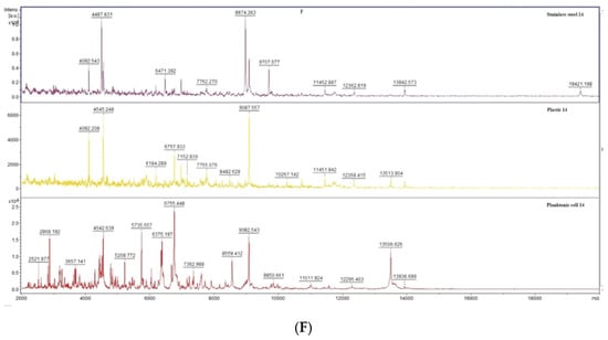 MALDI-TOF mass spectra of P. fluorescens biofilm development after EGEO exposition: (A)—3rd day; (B)—5th day; (C)—7th day; (D)—9th day; (E)—12th day; (F)—14th day.
