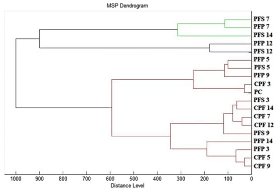 To visualize the similarity of the mass spectra, a dendrogram was constructed based on the MSP distances, and we can observe how the similarity evolved from day to day (Figure 2). The constructed dendrogram shows that the biofilms of the experimental group had the highest similarity in the early stages during day 3 (PFS 3 and PFP 3) along with the planktonic cells (PC) and controls (CPF 3−14). There was an increase in the MSP distances of the experimental groups over the days, with the greatest distance observed on day 14 of the experiment (PFS 14 and PFP 14), with a dominance on the anticortical surface (PFFS 14). The observations of the evolution of MSP distances based on the constructed dendrogram are in agreement with the analysis of the mass spectra and tell about the inhibitory effect on P. fluorescens biofilms produced by the influence of EGEO.
