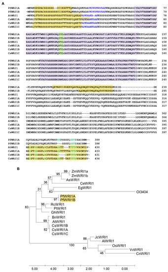 Alignment of the deduced amino acid sequences of WRI1 isoforms from P. frutescens, A. thaliana, and C. sativa and phylogenetic tree of PfWRI1 homologs from diverse plant species. (A) Whitish purple and green backgrounds indicate the conserved AP2/ERF DNA binding motifs and the transcriptional activation motif in WRI1, respectively. The predicted nuclear localization signals (NLS) sequences of AtWRI1A (PRPKRAKRAK, 334−42 aa), PfWRI1A (VKPKPKRVRAK, 36−46 aa), PfWRI1B (VKPKPKRVRAK, 38−48 aa), and CsWRI1A to C (RPKRANKRAK, 35−43 aa) are shown in blue letters. PEST motifs were analyzed by ePESTfind (https://emboss.bioinformatics.nl/cgi-bin/emboss/epestfind (accessed on 1 June 2000) and are shown in yellow backgrounds. Ten phosphorylation sites of Arabidopsis WRI1 are involved in its regulatory function [53], and their putative corresponding sites in PfWRI1s and CsWRI1s are shown in green letters. (B) Phylogenetic tree of PfWRI1 homologs from diverse plant species. The phylogenetic tree was generated using MEGA X by the maximum likelihood method. Bootstrap value percentages of 1000 replicates are shown at the branching points. AtWRI1, Arabidopsis thaliana (824599); PfWRI1s, Perilla frutescens var. frutescens in this study; AsWRI1, Avena sativa (SRX1079426); BnWRI1, Brassica napus (ABD16282.1); CsWRI1A, CsWRI1B and CsWRI1C, Camelina sativa; EgWRI1, Elaeis guineensis; GhWRI1, Gossypium hirsutum (TC200263); OsWRI1, Oryza sativa (CAE00853.1); PtWRI1, Populus trichocarpa (SRX1079428); Ol34044, Ostreococcus lucimarinus (34044); RcWRI1, Ricinus communis (AB774159.1, AB774160.1); ZmWRI1, Zea mays (ACF83189.1, ACF80269.1); JcWRI1, Jatropha curcas (AIA57945.1); AlWRI1, Arabidopsis lyrata (EFH52510.1); VvWRI1, Vitis vinifera (CBI32013.3); CnWRI1, Cocos nucifera (JQ040545).