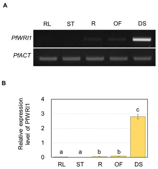 To examine the transcript levels of PfWRI1A and PfWRI1B in various Perilla organs, total RNAs were isolated from rosette leaves, stems, roots, open flowers, and developing seeds of P. frutescens plants, and subjected to the RT-PCR and RT-quantitative PCR analyses. Both RT-PCR and RT-qPCR analyses revealed that PfWRI1s were predominantly ex-pressed in developing Perilla seeds (Figure 2A,B). Initially, we tried to design PfWRI1A- or PfWRI1B-specific primers. The design of PfWRI1B-specific primers was successful, but it failed to design PfWRI1A-specific primers due to a high sequence homology between PfWRI1A and PfWRI1B (Figure S2). Thus, the total transcript levels of PfWRI1A and PfWRI1B were shown in Figure 2B.